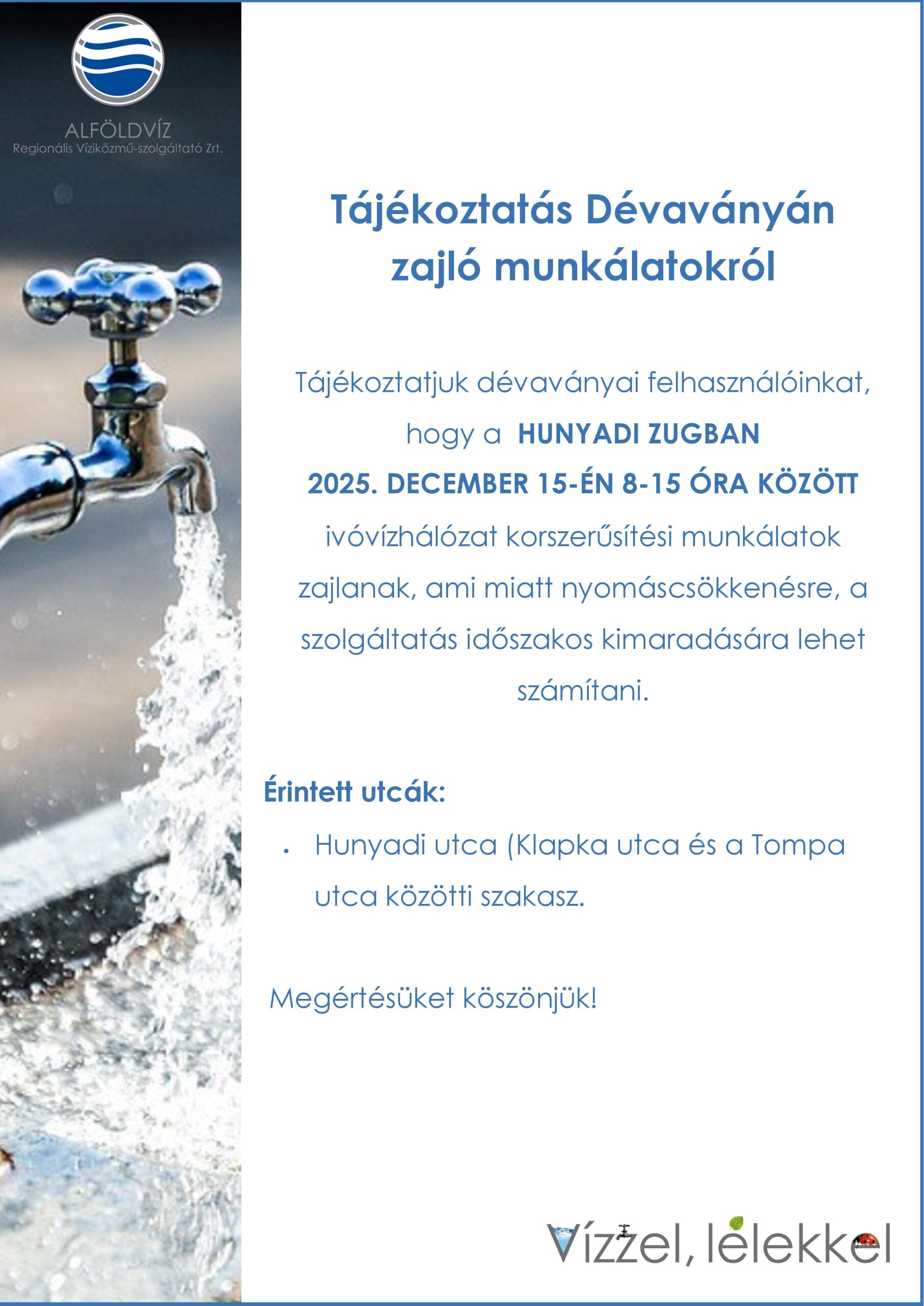 Aktuális, Hírek 2025. DECEMBER 15-ÉN 8-15 ÓRA KÖZÖTT ivóvízhálózat korszerűsítési munkálatok zajlanak, ami miatt nyomáscsökkenésre, a szolgáltatás időszakos kimaradására lehet számítani. Felhívás TÁJÉKOZTATÁS decemberi ügyfélfogadásról