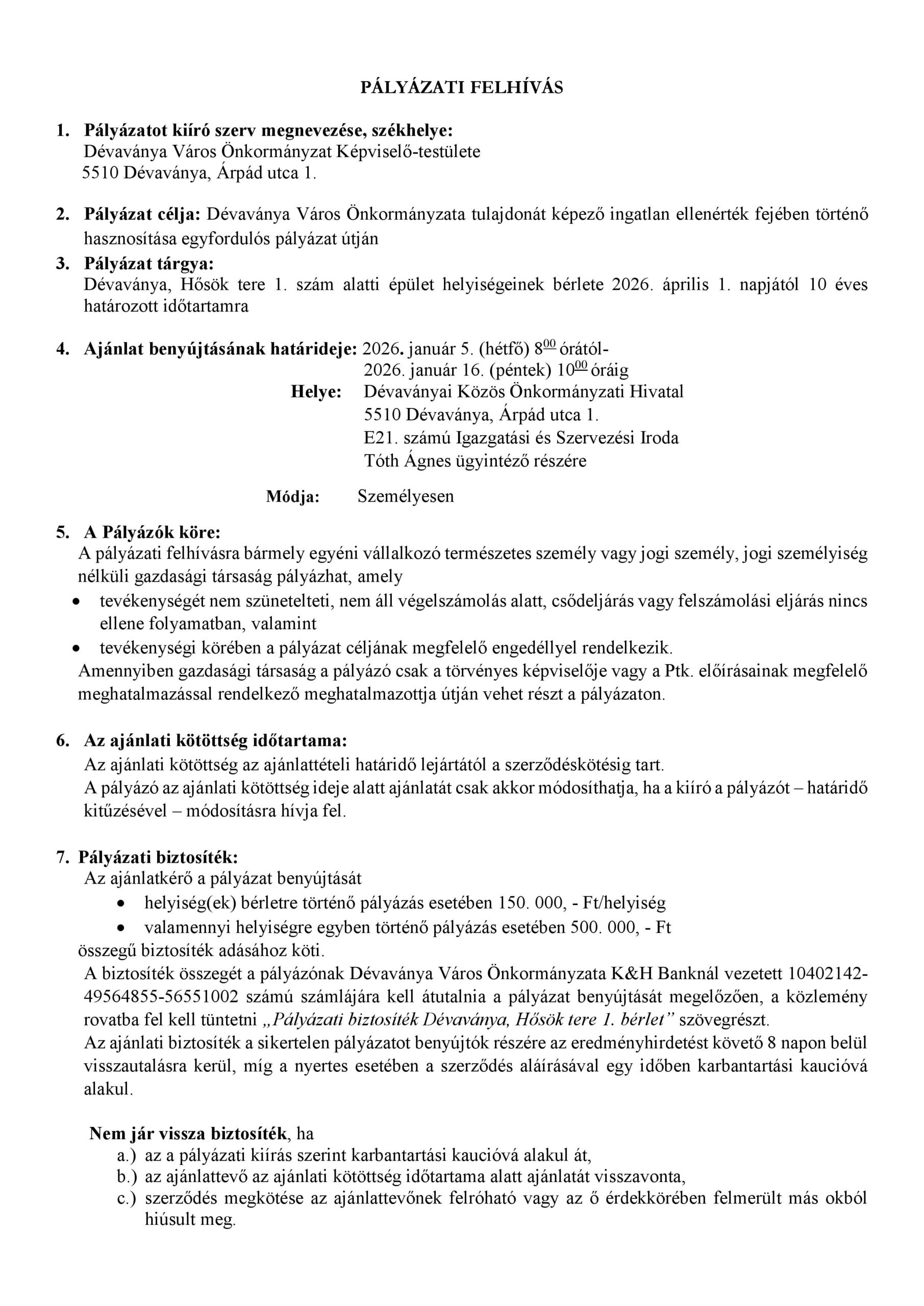 Aktuális, Hírek PÁLYÁZATI FELHÍVÁS – Dévaványa, Hősök tere 1. szám alatti épület helyiségeinek bérlete 2026. április 1. napjától 10 éves határozott időtartamra 2025. DECEMBER 12-ÉN 8-14 ÓRA KÖZÖTT ivóvízhálózat korszerűsítési munkálatok zajlanak, ami miatt nyomáscsökkenésre, a szolgáltatás időszakos kimaradására lehet számítani. PÁLYÁZATI FELHÍVÁS – Dévaványa Város Önkormányzata tulajdonát képező Büfé megnevezésű vendéglátói egység hasznosítása egyfordulós pályázat útján